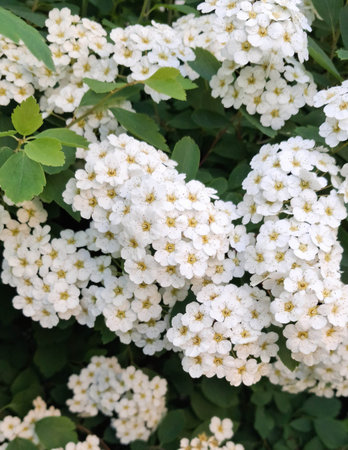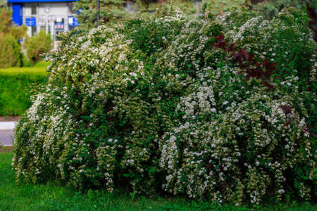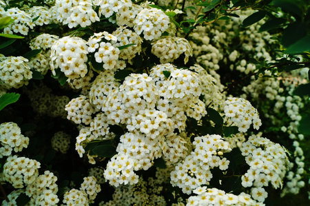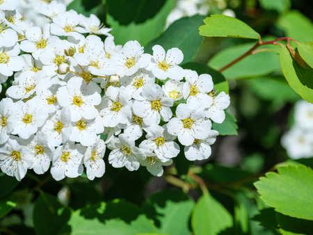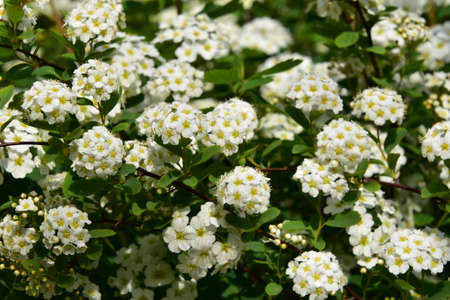 Spiraea vanhouttei meadowsweet ornamental shrub in bloom, group of bright white flowering flowers on branches, green leaves