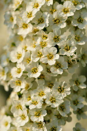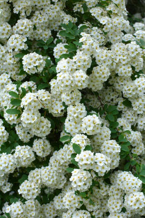 Many white spirea flowers for the whole background are collected in bunches.