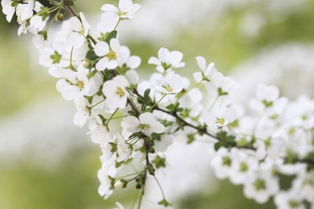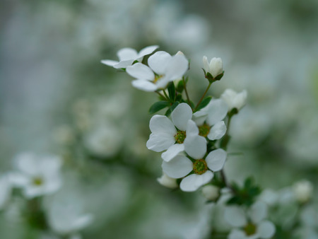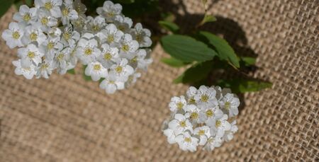Branch with small white flowers. Close-up photo of white flowers of the shrub Spiraea cantonense.