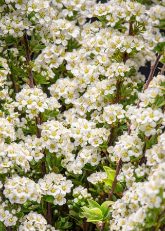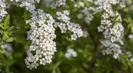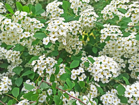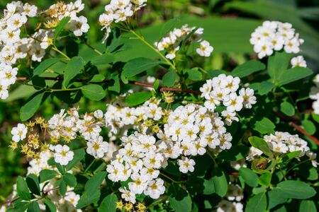 Spiraea white flowers on the background of green leaf. An ornamental plant used in landscape design, as a living fence and not only.
