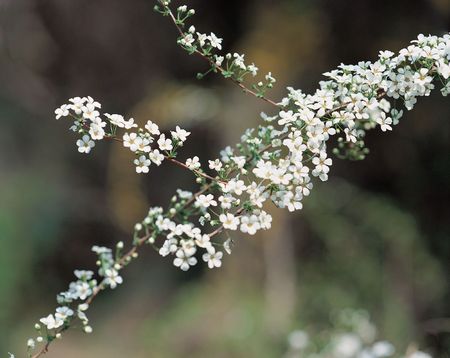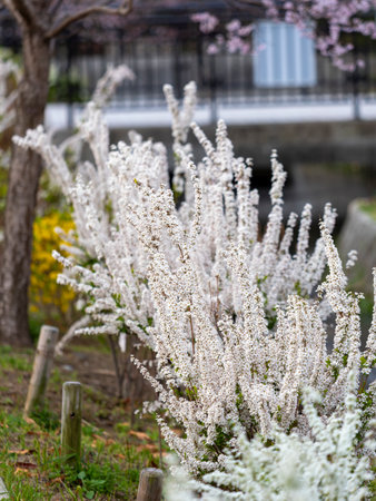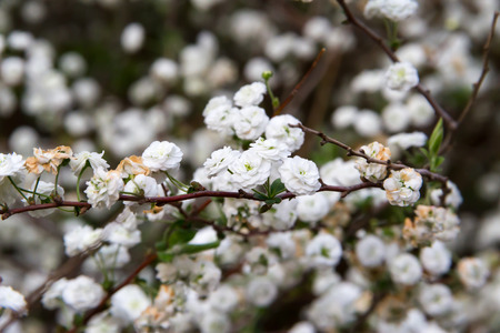 Beautiful flowering spirea twigs in the garden