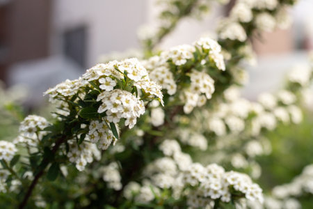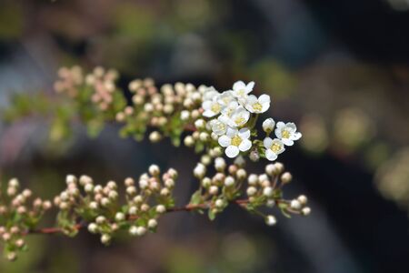 Bush of flowering spiraea with clusters of small white flowers and flowerbuds, close-up in selective focus