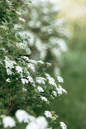 Blooming white flowers of spirea in summer garden, selective soft focus.