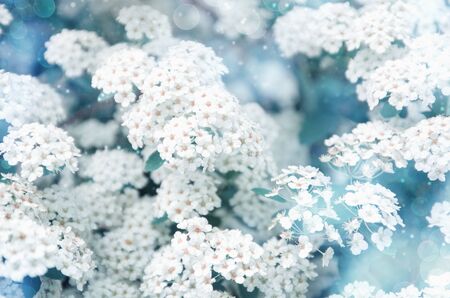 Beautiful spring background with white spirea flowers. Holiday backdrop with blue and light blurred