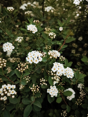 Clusters of delicate white flowers blooming on a bush, creating a beautiful natural display in Prague, Czechia, copy space, wallpaper