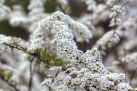 Close up of white spiraea flowers in bloom. Natural Background.