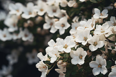Clusters of delicate white flowers blooming on a bush, creating a serene natural scene in Prague, copy space, wallpaper