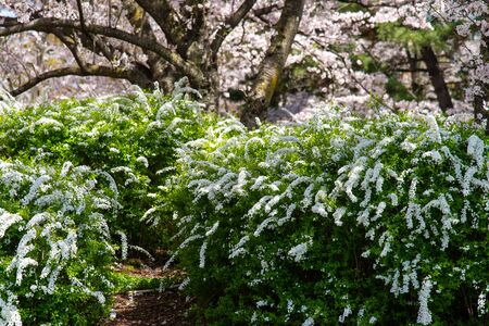 white spirea on a sunny spring day
