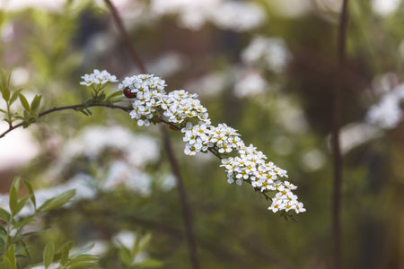 Blooming white flowers of Spirea paniculata in spring