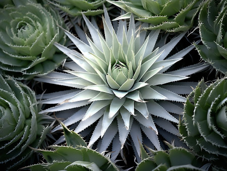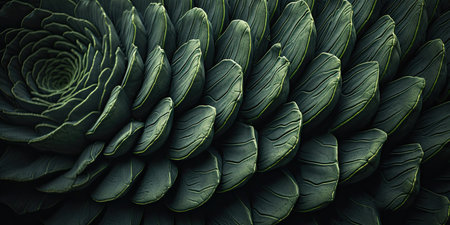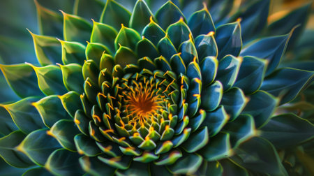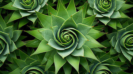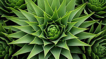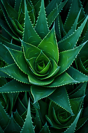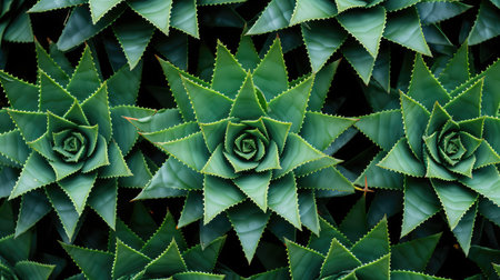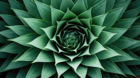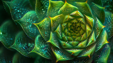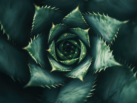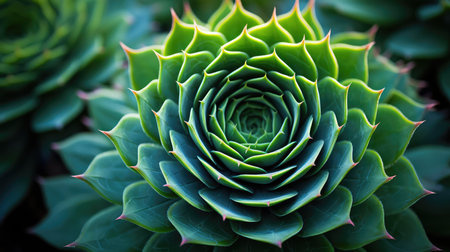 Spiral pattern of succulent plant leaves with sharp, pointed edges, creating a mesmerizing geometric design. The green hues are rich and varied, emphasizing natural symmetry