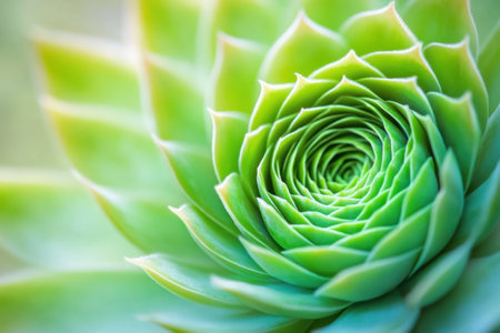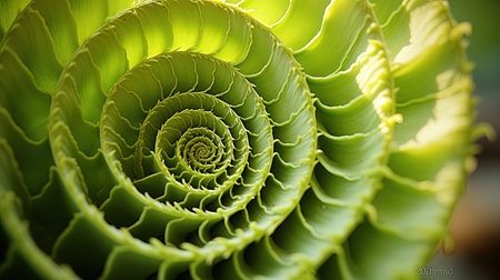 Close-up image of a succulent plant's leaves arranged in a striking spiral pattern. The vibrant green color and intricate geometric design create a visually appealing image. The image focuses on the detailed texture and structure of the leaves.