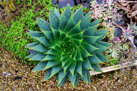 closeup of spiral aloe polyphylla leaves plant on stones.