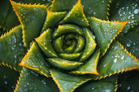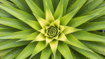 A top-down close-up view of a green succulent plant with pointed leaves arranged in a perfect spiral. Water droplets cling to the fresh leaves, enhancing the vibrant green color and geometric natural pattern.
