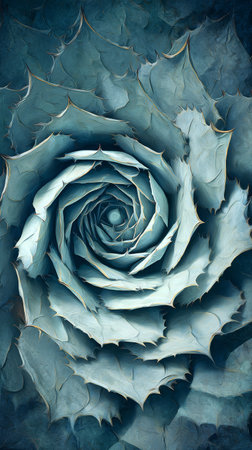 A detailed view of a blue agave plant reveals a captivating spiral pattern. The layered foliage creates an impressive design filled with unique textures and shades of blue.