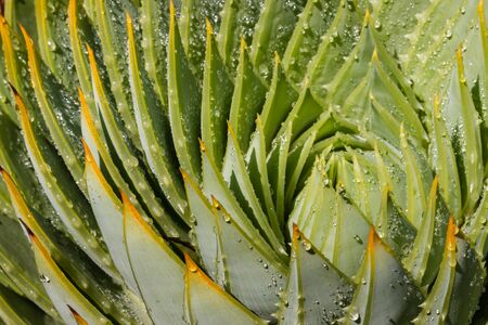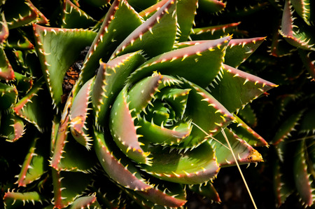 Closeup aloe vera succulent plant with hard spiky edged leaves leading into center of plant.