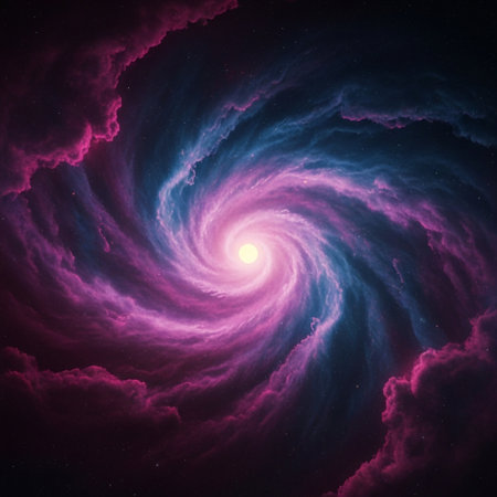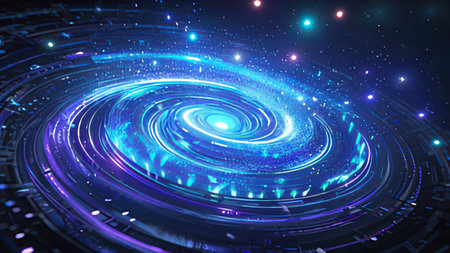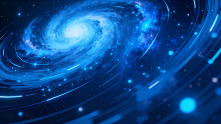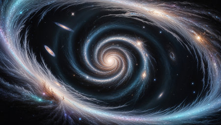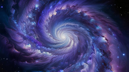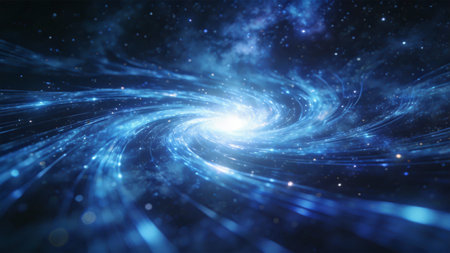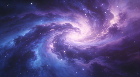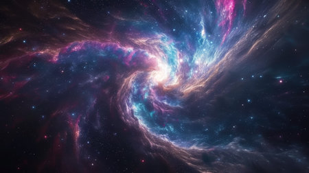 Ethereal digital composition capturing infinite cosmic depth via swirling gradients, luminous particle effects, and subtle glow layers for immersive vastness. Suited for sci-fi posters, album covers, app interfaces, educational astronomy visuals, or fantasy game assets. High-fidelity execution offers scalable quality for designers targeting entertainment, publishing,... AI-generated illustration.