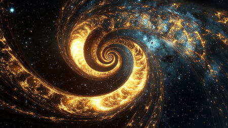 Golden spiral design, perfectly illustrating the golden ratio, set against a starry space background with intricate patterns of light and energy