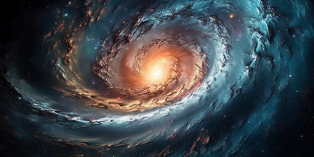 A spiral galaxy with a bright orange center. The galaxy is filled with stars and dust, and the orange center is a bright point of light. Concept of wonder and awesome at the vastness of the universe