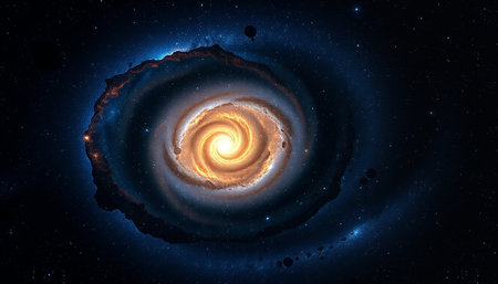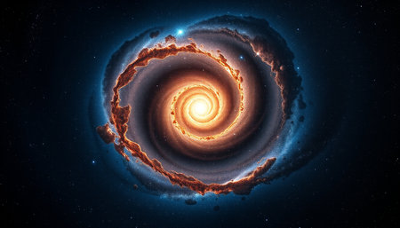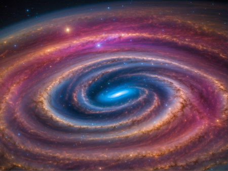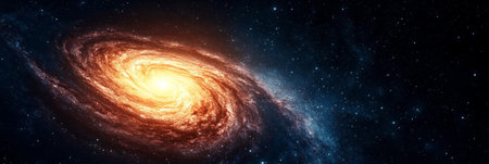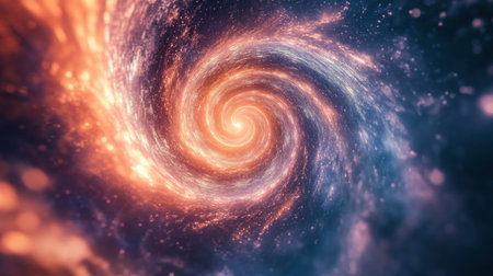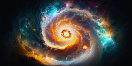 An image showcases a spiral galaxy with a radiant central core. The composition features swirling arms and a multitude of stars, exhibiting hues of orange, blue, and gold. The artwork evokes a sense of vastness and cosmic wonder, potentially suitable for educational or illustrative purposes.