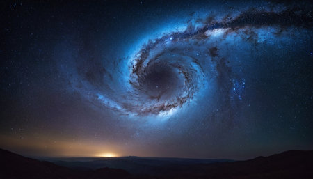 Generative AI : Panoramic shot of Milky Way Galaxy on a blue night Astro Photography Photo of spiral galaxy Image contains noise