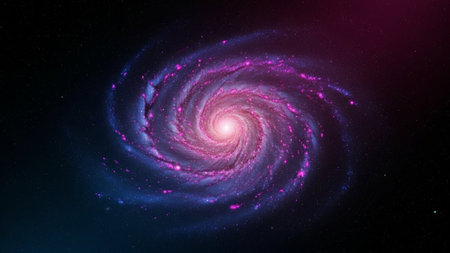 Stunning spiral galaxy with vibrant purple and pink nebulae in deep space.