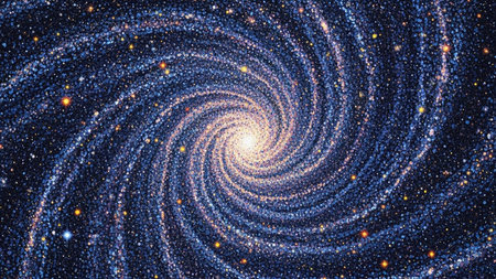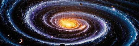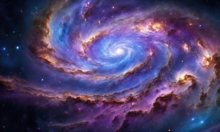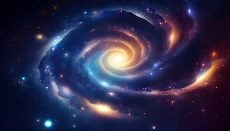 An illustration depicts a vibrant spiral galaxy. The artwork showcases swirling arms of blue and golden hues, with a central bright core. Abundant small points of light are scattered throughout the composition. It is a visually engaging piece that could be suitable for various commercial or editorial applications.