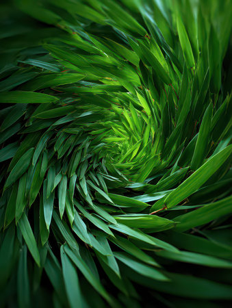 A captivating spiral design formed by green leaves, showcasing nature's beauty and vibrant colors. This abstract photo evokes tranquility and harmony.
