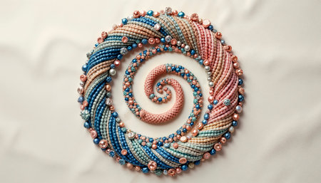 Beautifully arranged handmade beads in vibrant colors spiral on a stone surface, creating an eye-catching and artistic display perfect for jewelry lovers.