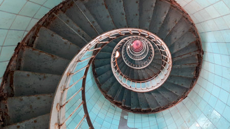 View from above of an antique spiral staircase with iron steps and railings. Fragment of narrow indoor in a tall building spiral staircase. Interior details. Selective focus