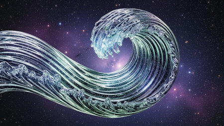 A glass wave crashing in a starry space with a colorful nebula in the background. Clear details and vibrant co...