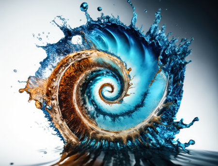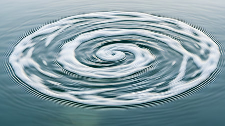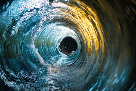 A powerful water vortex spins dramatically, sending waves crashing outward. The vibrant blue ocean reflects sunlight, enhancing the scene's captivating beauty amidst serene surroundings.