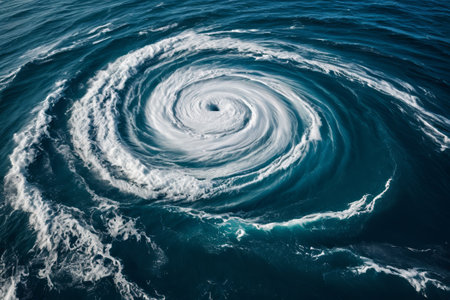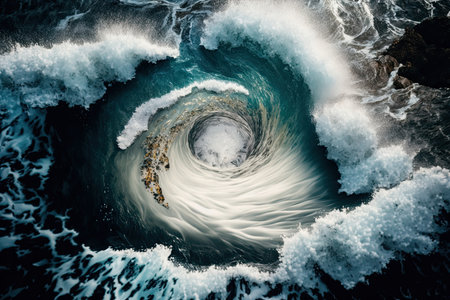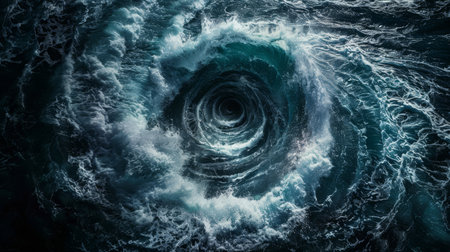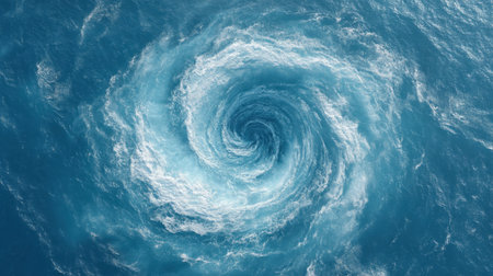 An immense natural ocean whirlpool creates a captivating vortex of rapidly swirling water. The aerial perspective highlights the dynamic movement of the deep blue water and frothy white foam.