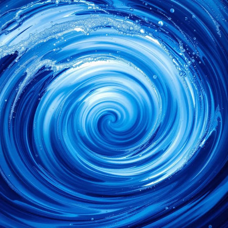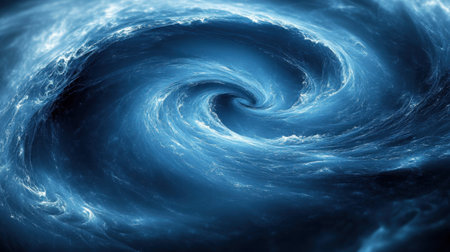 A dynamic blue water vortex swirl with white foam and turbulent waves creating a powerful and energetic spiral pattern.