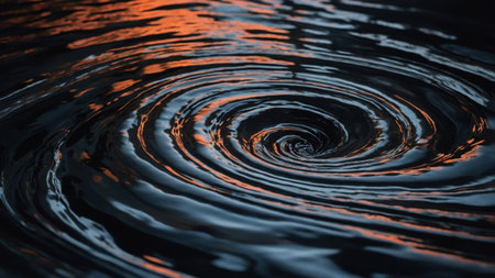 Mesmerizing vortex forming concentric circles in a dark pool reflecting a vibrant orange sunset