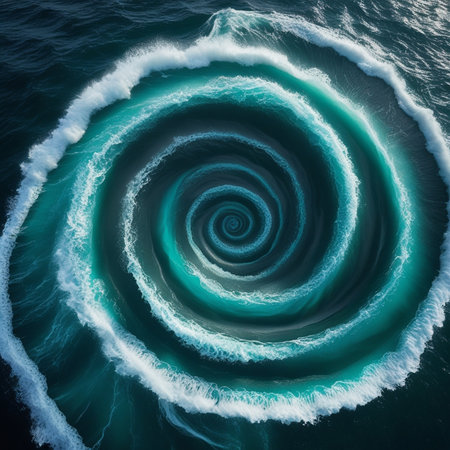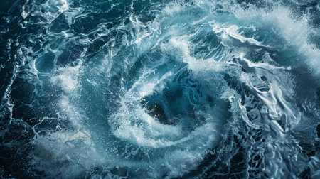 A close-up aerial view showcases intricate spiral patterns formed by white sea foam swirling dynamically on the deep blue ocean surface, creating a...