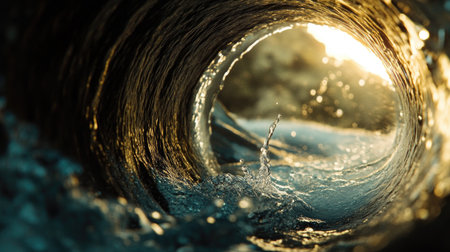 This striking image captures sunlight filtering through a pipe, showcasing the captivating flow of water and creating a serene aquatic scene.