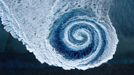 A stunning aerial view of a swirling ocean wave forming a beautiful spiral pattern as it meets the sandy beach. This image captures the dynamic movement and natural beauty of the sea, showcasing the vibrant blue water and the soft sandy shore. Perfect for themes of tranquility, nature, and coastal serenity.