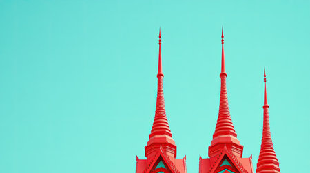 A striking image of vibrant red temple spires reaching towards a bright blue sky, showcasing the intricate architecture and cultural beauty of the region.