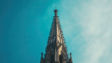 A towering cathedral spire reaching into a bright, cloudless sky.