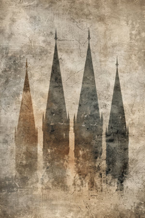 A minimalist image of four church spires silhouetted against a textured wall. The image captures a sense of mystery and history.