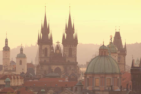 Silhouette of two towers of Church of Our Lady before Tyn in morning Prague, Czech Republic