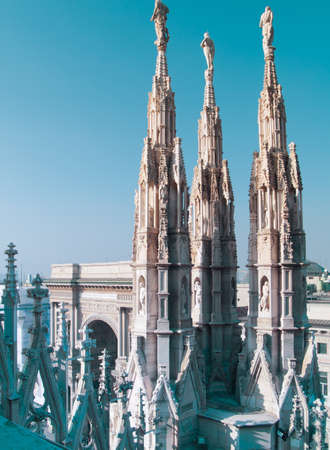 gothic spires over blue sky on roof of Milan cathedral Duomo , Italy