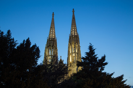 Low angle view of the towers on the Votive Church in Vienna at dusk