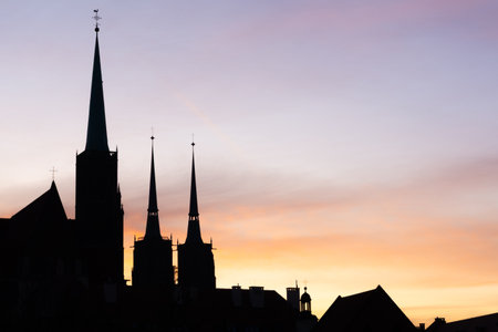 Church Spiers In Silhouette At Sunset Over City Skyline, Peaceful Evening Sky Background