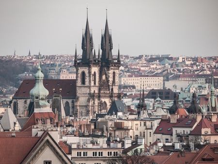 Prague Old Town with Church of Our Lady before Tyn. Aerial view from Letna Park, Czech Republic