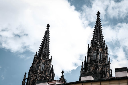 cathedral towers medieval architecture religion building exterior facade urban view in Vienna capital of Austria central European region twilight lighting and blue sky white clouds background