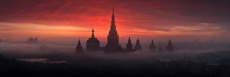 Black silhouette of Cathedral of Vasily the Blessed, Spasskaya Tower and Kremlin. Sunset sky. High quality photo