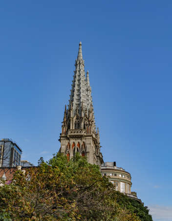 Former South Church with Kirk of St Nicholas (Triple Kirk) in the background surrounded by trees in Aberdeen, Scotland, UK