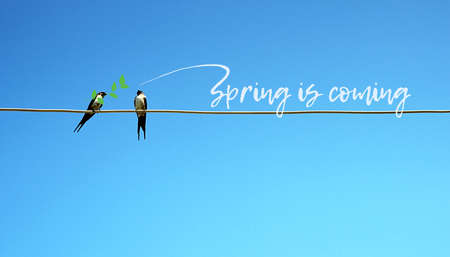 Spring is coming concept. Two swallow sitting on a wire in one branch in beak. other tweets - spring comes. cute pretty picture