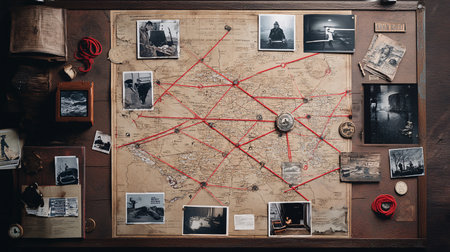 High-angle, top-down cinematic photo of a corkboard collage covered in realistic instant camera phot